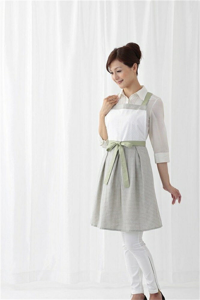 胸元にストライプ柄をあしらった、可愛らしいエプロンです!ストライプの方向を胸元と腰下で使い分けてアクセントにしています。
